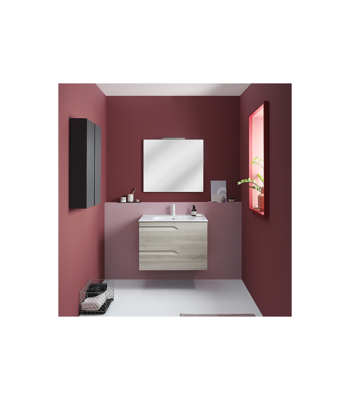 VITALE es una colección pensada para la vida real. Compuesto por mueble suspendido de fondo reducido de 39 cms, 2 cajones de extración total y tirador tipo uñero. Bandeja organizadora en el cajón superior. Encimera cerámica modelo SPIRIT con lavabo integrado. Espejo MURANO de 70 cms de alto y trasera reforzada. Aplique LED de 30 cms. Disponible en 2 medidas.
