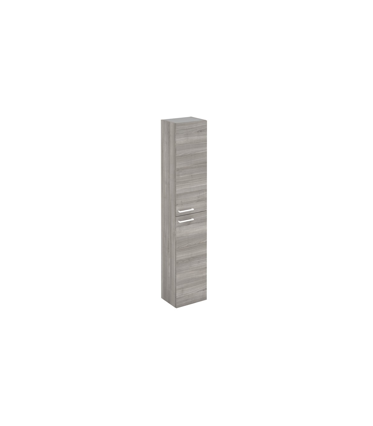 VITALE columna suspendida con dos puertas reversible, para elegir la dirección de apertura de sus puertas. Color GRIS ARENADO. Distribución interior con 2 estantes móviles de madera y un estante fijo de madera. Tiradores blanco mate y cierre progresivo de puertas. Mueble auxiliar del conjunto con lavabo del mismo nombre.