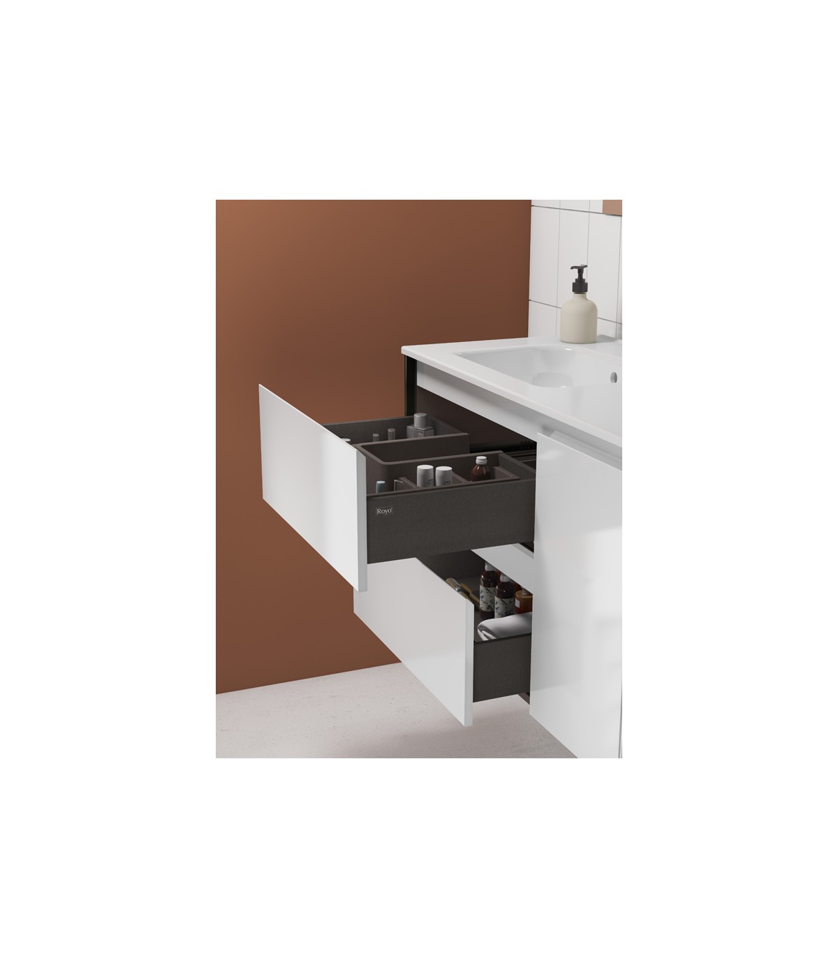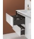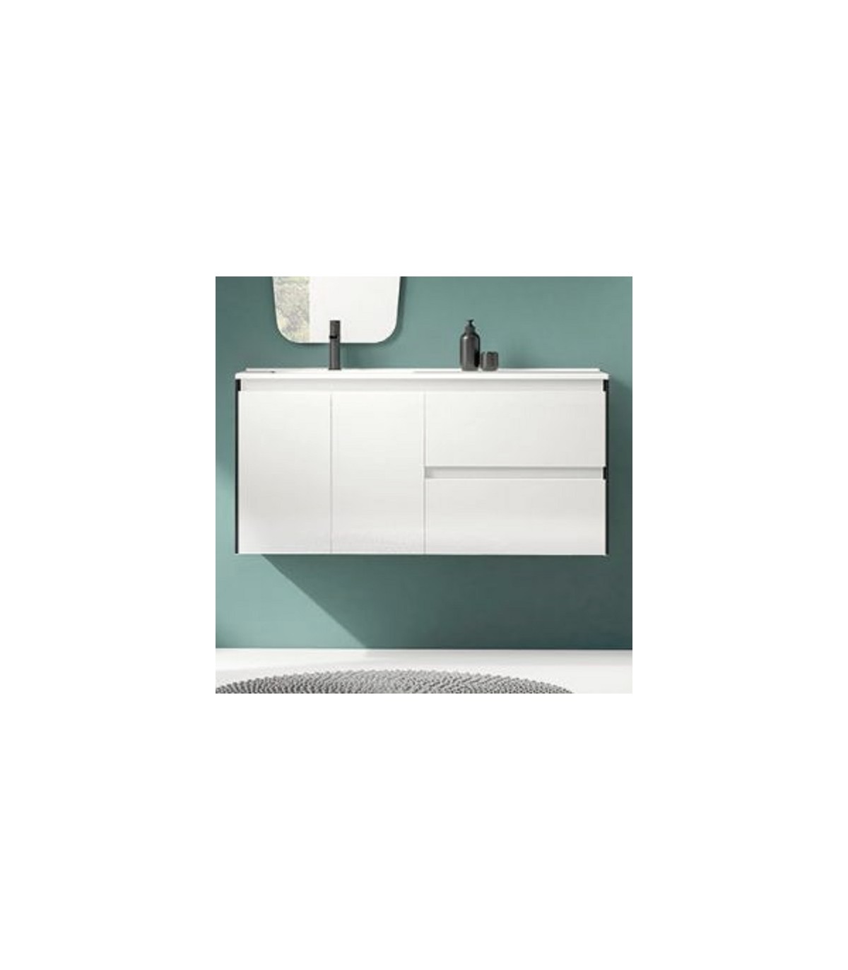 Mueble suspendido fabricado en melamina polilaminada, con módulo de 2 cajones con cierre close-soft y módulo de 2 puertas con cierre close-soft. Lavabo cerámico con seno desplazado.