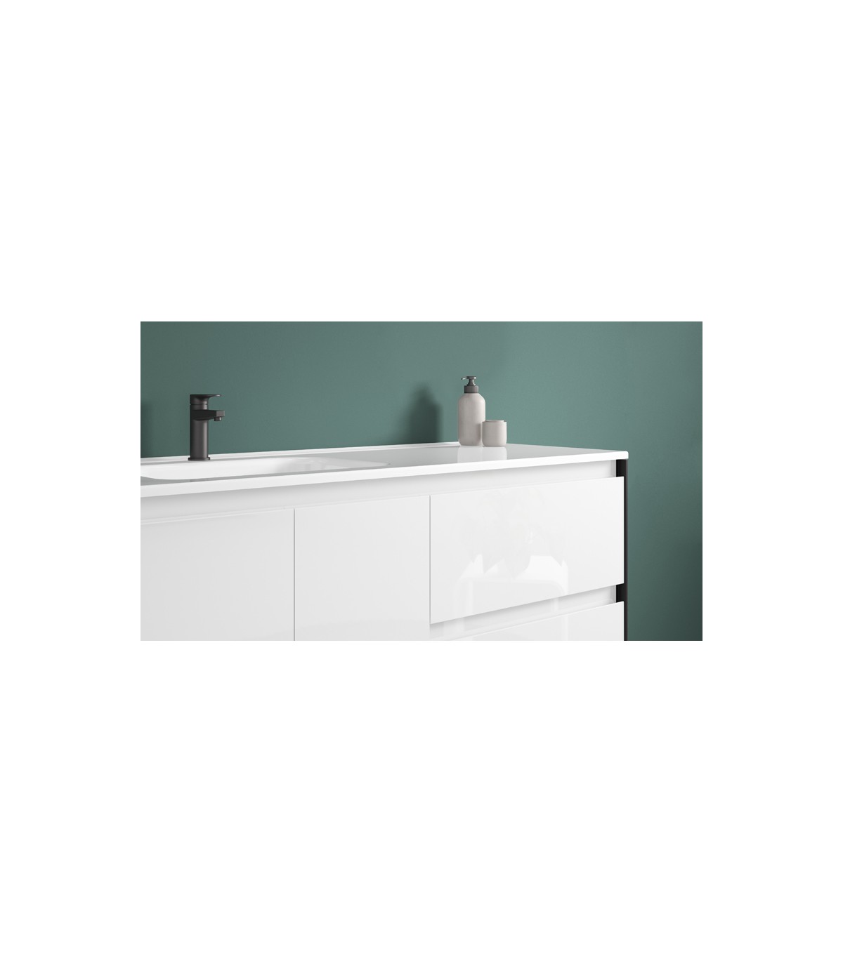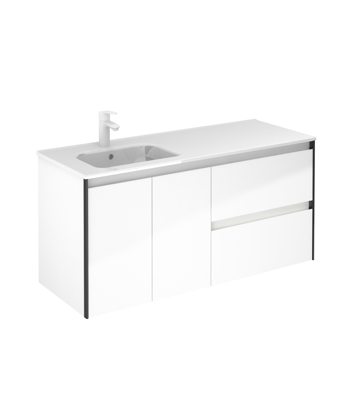 LOOK+ Mueble suspendido lacado alto brillo, con fondo 46 cms. Compuesto por módulo de 2 cajones y 2 puertas con perfiles en negro, ambos con cierre amortiguado. Enciméra cerámica SLIM con seno desplazado y ofiricio para un solo grifo.