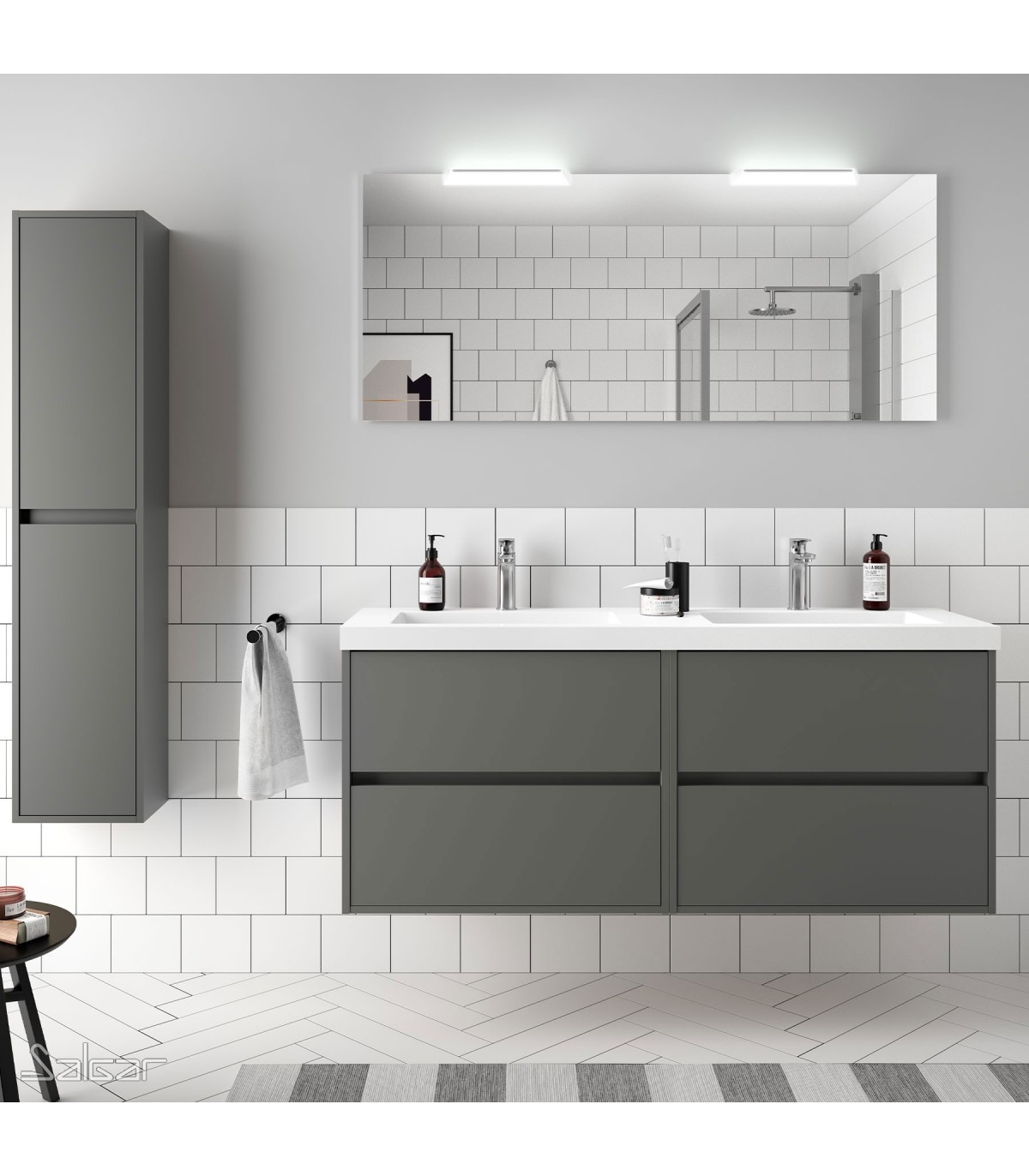 El conjunto está formado por 2 muebles de 70 cms (140 cms) y encimera de carga mineral blanca brillo con 2 senos, espejo y 2 apliques LED. Los 4 cajones tienen cierre amortiguado y tirador tipo uñero integrado en el frente del mueble aunando funcionalidad y diseño. Todos los muebles de Salgar se envían montados. No incluye grifería, válvula de desagüe, sifón ni columna auxiliar a juego.