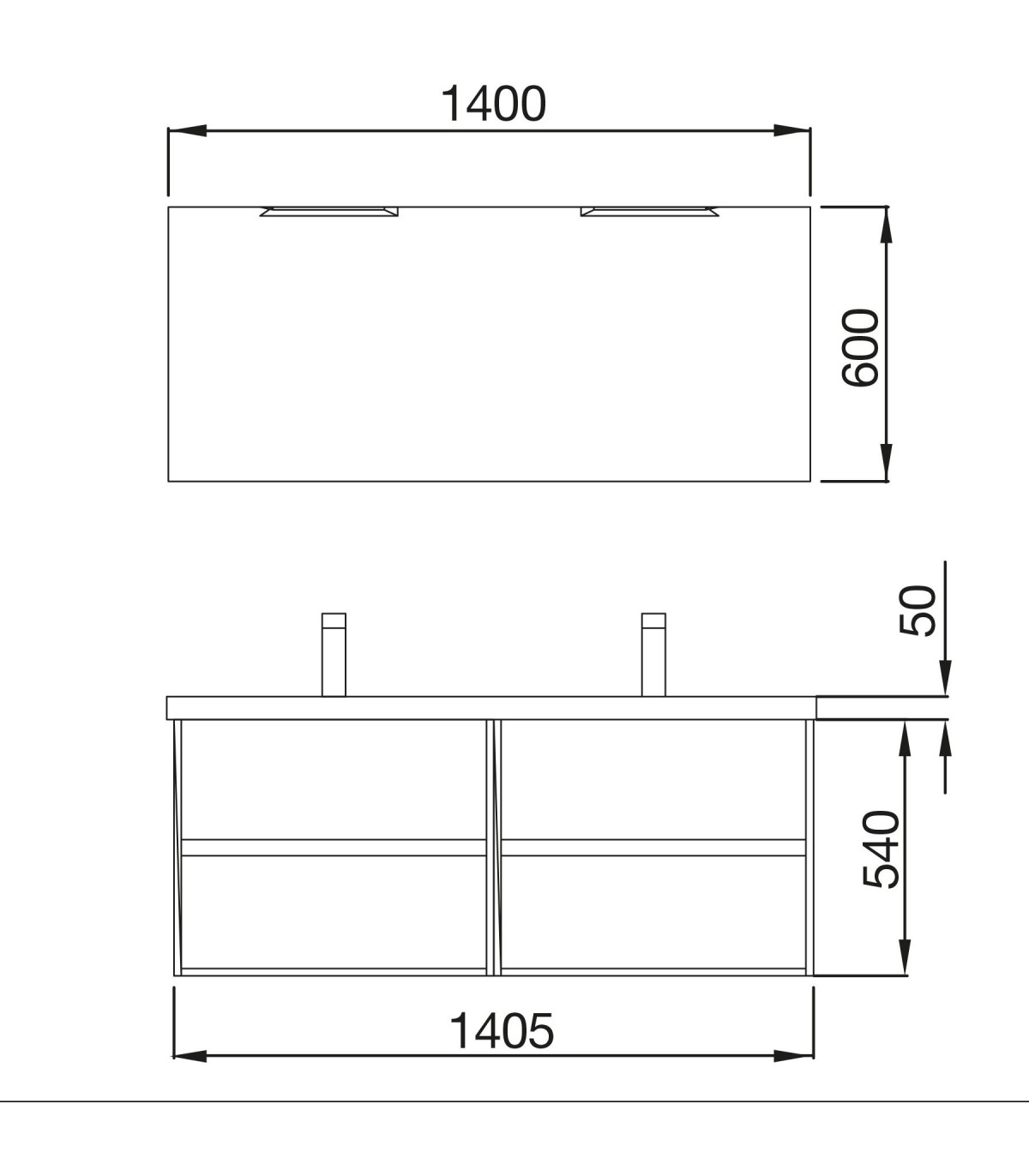 Mueble suspendido Noja fondo 45 cms con frente y laterales fabricados en tablero laminado de 16 mm con cantos en PVC. Lavabo TOSCANA 1400 doble seno cuadrado fabricado con CARGA MINERAL BLANCA de medidas 1405x50x460 mm. Espejo de luna pulida en medidas iguales al ancho del mueble. Aplique acabado en cromo brillo. Dispone de dos luces led de 6w.