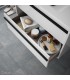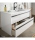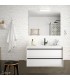 Conjunto compuesto por mueble suspendido de fondo 45 cms, con dos cajones con cierre amortiguado. Tirador en negro mate. Frente y laterales fabricados en tablero laminado de 16 mm con cantos en PVC. Lavabo de porcelana blanca. Espejos vertical/horizontal de 60x80 (de 80x100 sólo en conjunto de 100). Aplique en cromo brillo. Luz led de 6w con resistencia al agua 308 mm