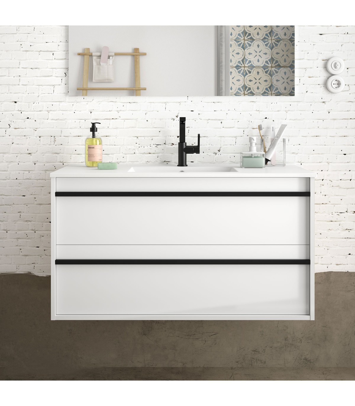 Conjunto compuesto por mueble suspendido de fondo 45 cms, con dos cajones con cierre amortiguado. Tirador en negro mate. Frente y laterales fabricados en tablero laminado de 16 mm con cantos en PVC. Lavabo de porcelana blanca.