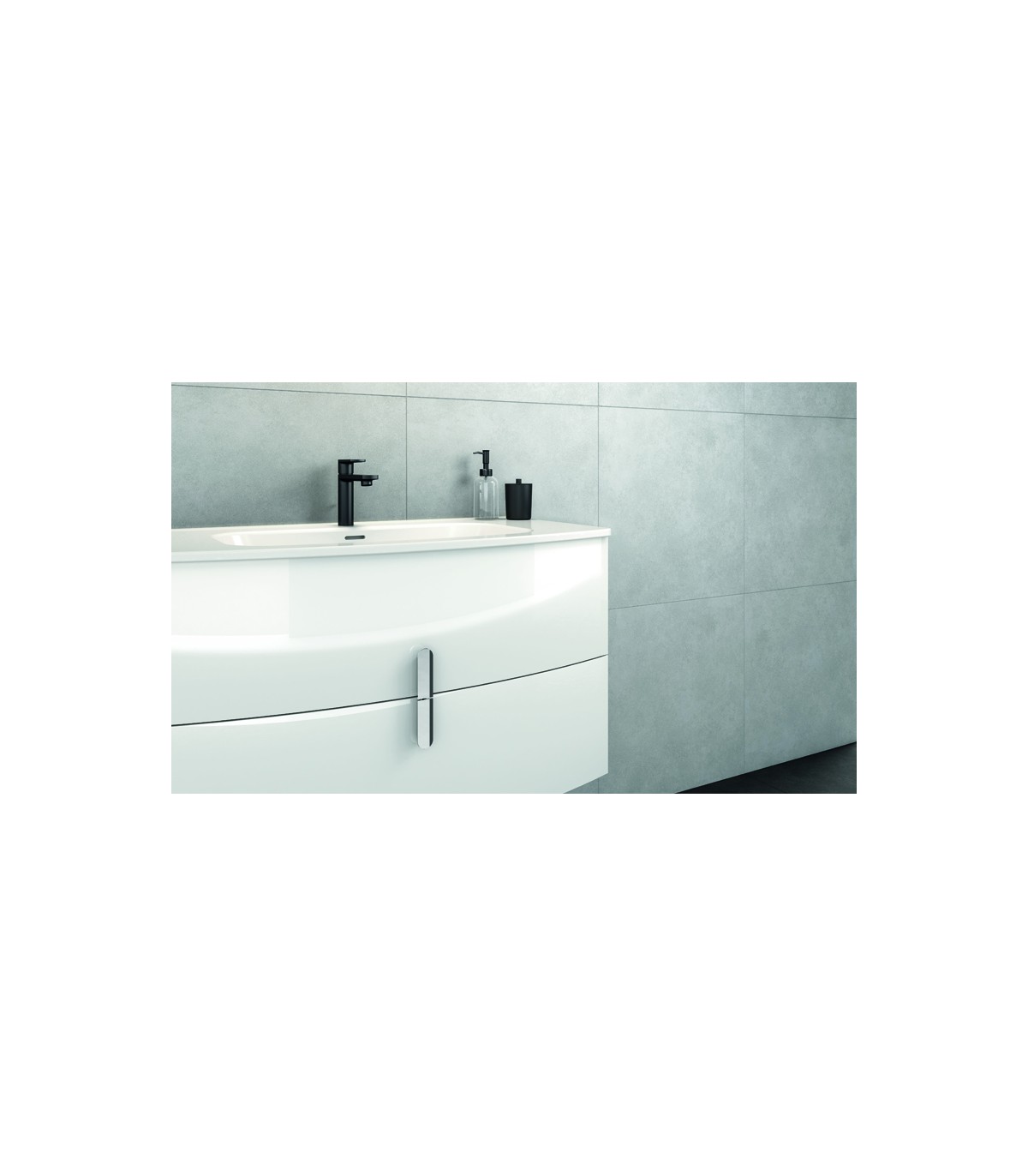 ROUND Conjunto de Mueble suspendido lacado en blanco alto brillo, con forma curva que transmiten elegancia, dinamismo y frescura. Original tirador cromado que lo hace inconfundible. Incorpora un organizador en el cajón superior, encimera cerámica curva y espejo con aplique LED. Dispone de columna auxiliar a juego NO INCLUIDA.