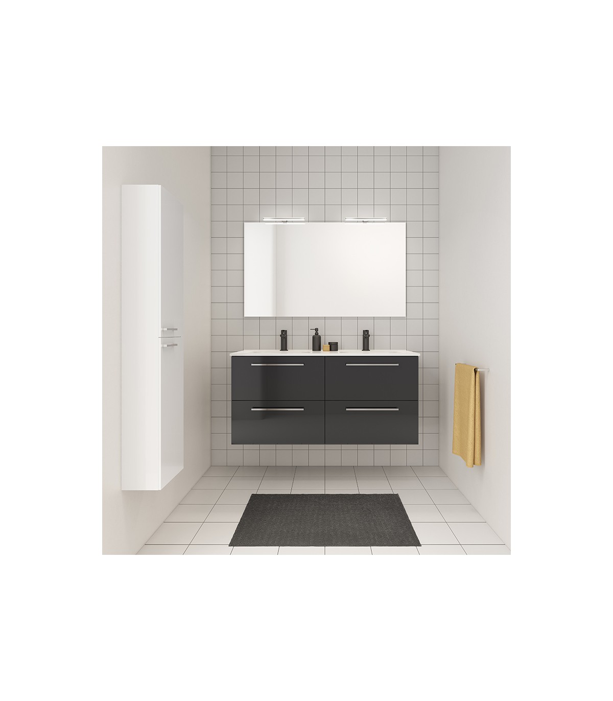 EASY es la colección de mueble para el baño que trasmite limpieza y elegancia en su diseño. Mueble de 120 cms con cuatro cajones suspendido de extración total, cierre amortiguado y con bandeja organizadora en los cajones superiores. Acabado del mueble lacado en GRIS ANTRACITA BRILLANTE. Encimera cerámica SLIM con 2 senos incorporado. Dispone de columna suspendida a juego no incluida.