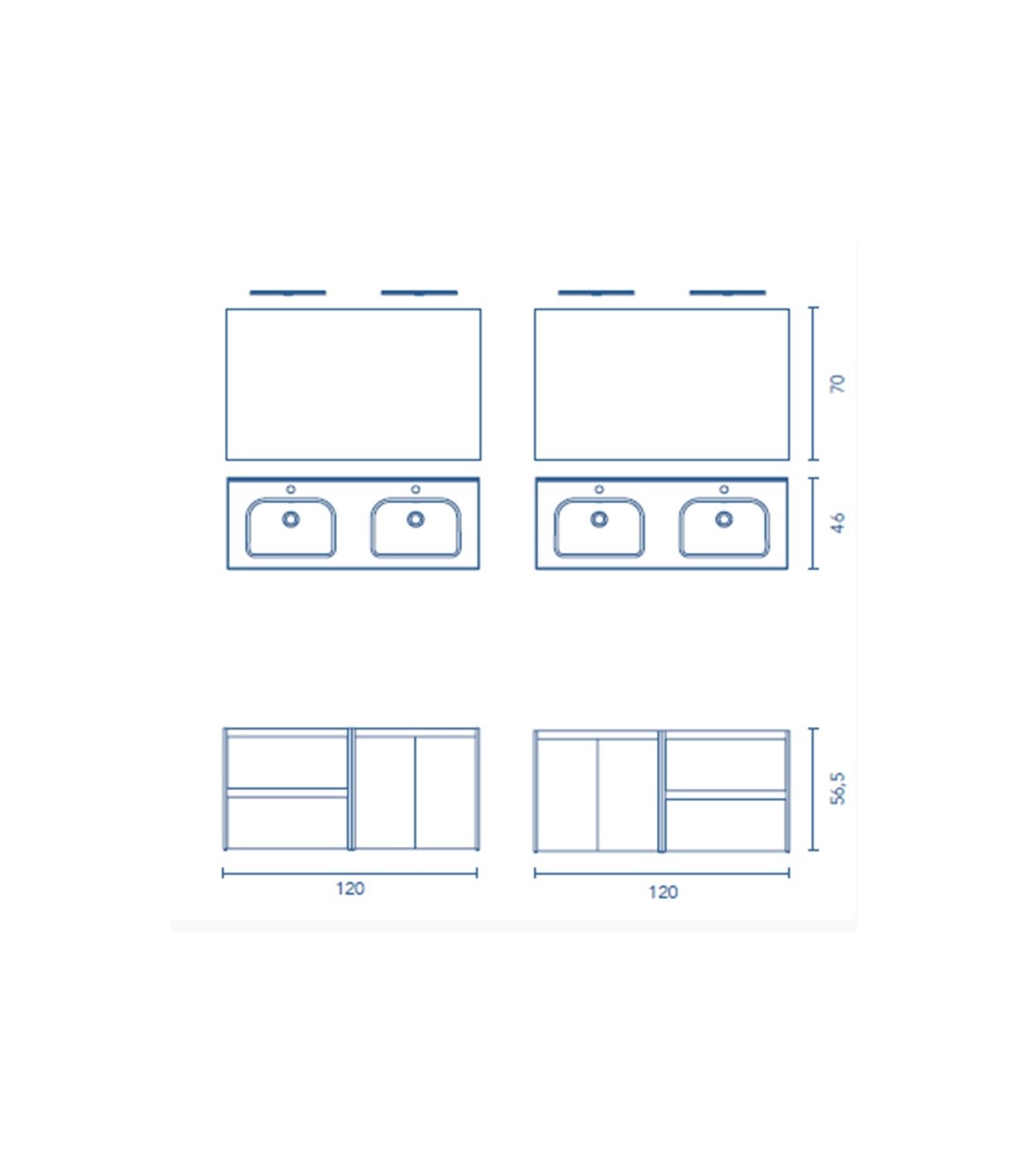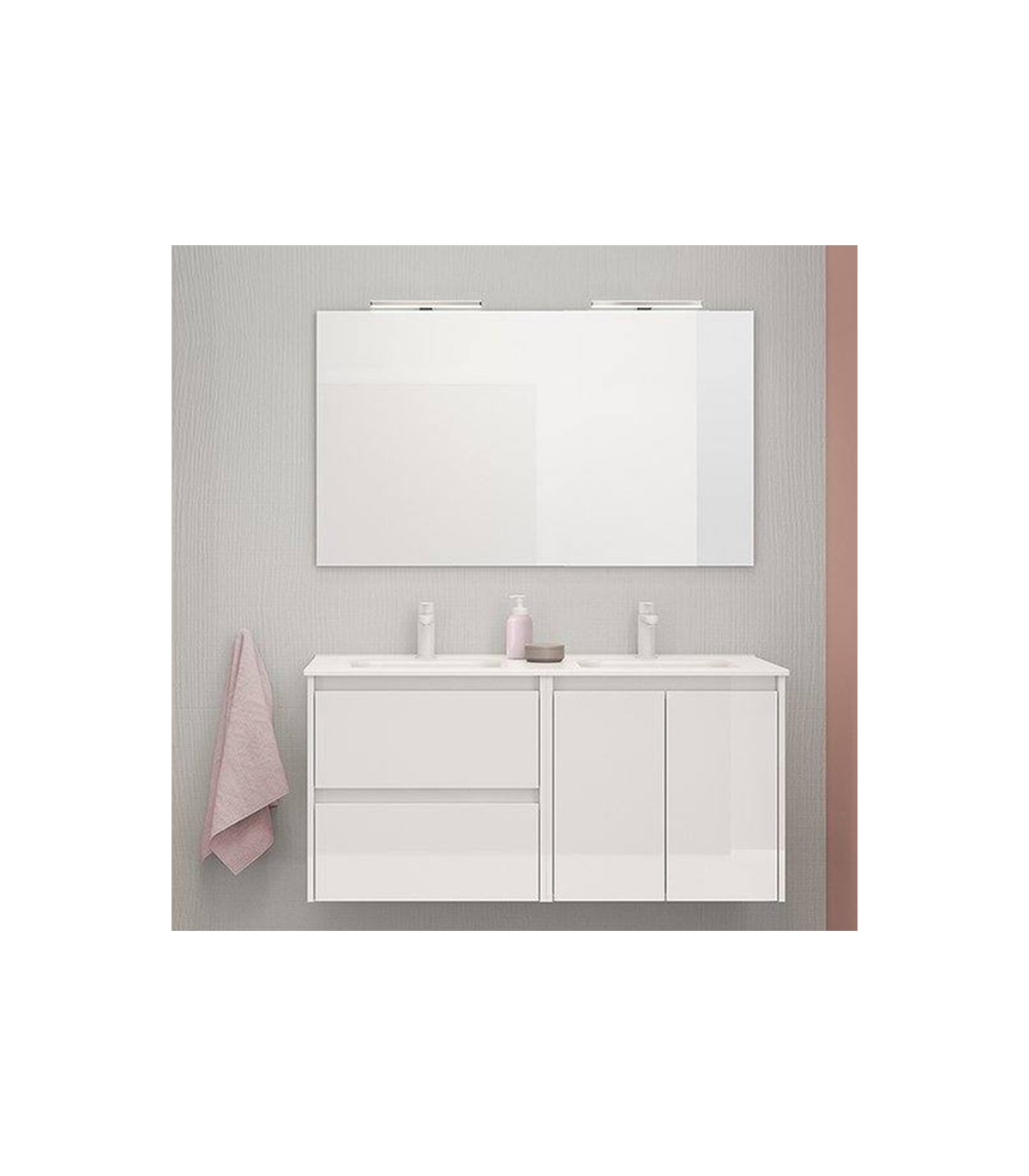 La belleza atemporal de la serie SANSA refleja la funcionalidad de sus formas rectas con su tirador integrado. Compuesto por mueble suspendido de 120 cms y fondo 46 cms, con módulo de 60 cms 2 cajones y módulo de 60 cms 2 puertas. Encimera cerámica SLIM con 2 senos integrado. Espejo MURANO de 70x120 cms con trasera de madera y 2 apliques LED de 30 cms y 8W.
