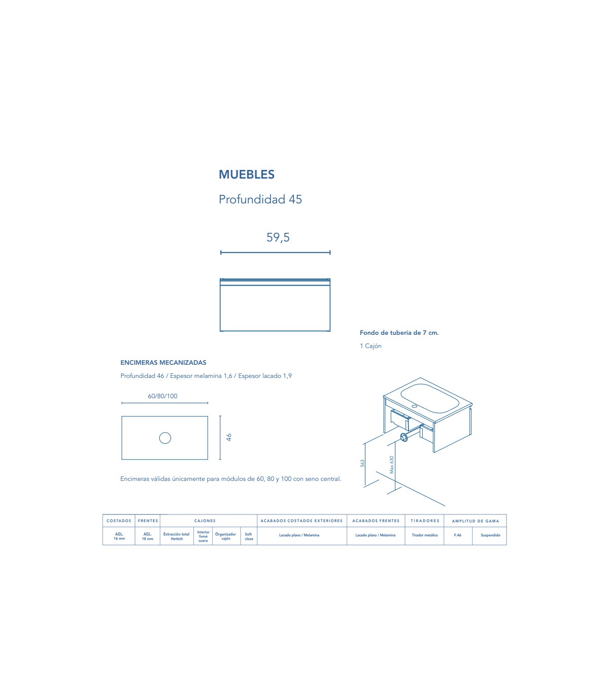Fondo del lavabo 46cm. Fondo del mueble 45cm. Mueble con salva sifón y organizador de cajón. Mueble sin tirador. Acabado en lacado plano / melamina. No incluye grifería ni válvula de desagüe. Todos los muebles se entregan montados y preparados para su instalación. Fabricado en España.