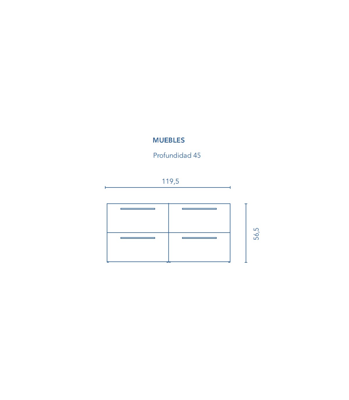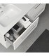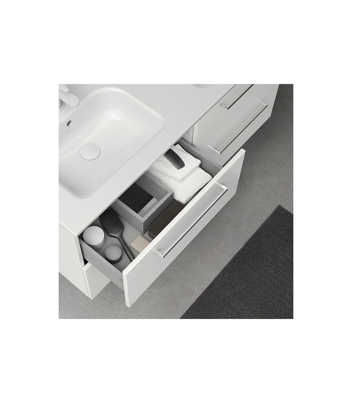 Mueble con estructura con tablero de 16 mm y frente en DM de 18 mm lacado alto brillo en caso del color blanco y antracita, y melaminas arenadas en caso del wengué y nogal. Cajones con guia oculta de extracción total y cierre amortiguado. Tirador metálico en cromo brillo. Lavabo cerámico modelo Slim blanco de 121x46. El mueble se entrega montado y preparado para la instalación.