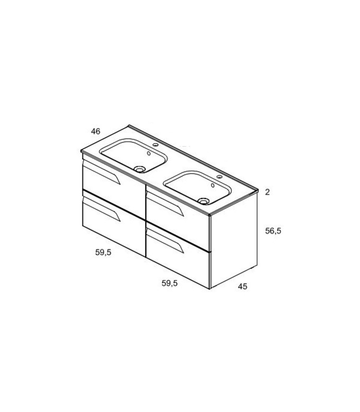 Mueble 2 unidades de mueble de 59,5x45x56,5 con estructura en tablero de 16mm y frente en polilaminado de 18mm. Cajones con guías de cierre amortiguado Soft Close. Lavabo cerámico SLIM de 120x46x1.7 cm. No incluye grifo ni válvula de desagüe. Todos los muebles de Royo se envían montados y preparados para su instalación.