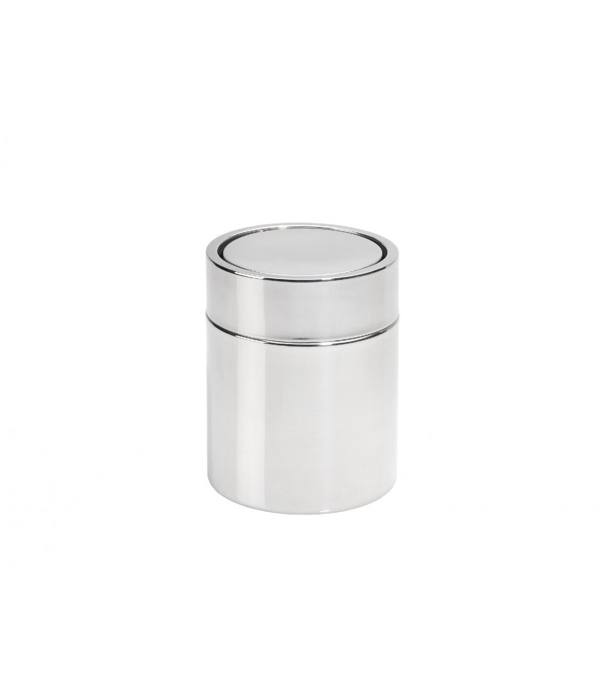 Pequeña papelera fabricada en acero inoxidable con apertura en la tapa superior con sistema basculante. Ideal para colocar en la encimera del cuarto de baño. Acabado cromado brillante.