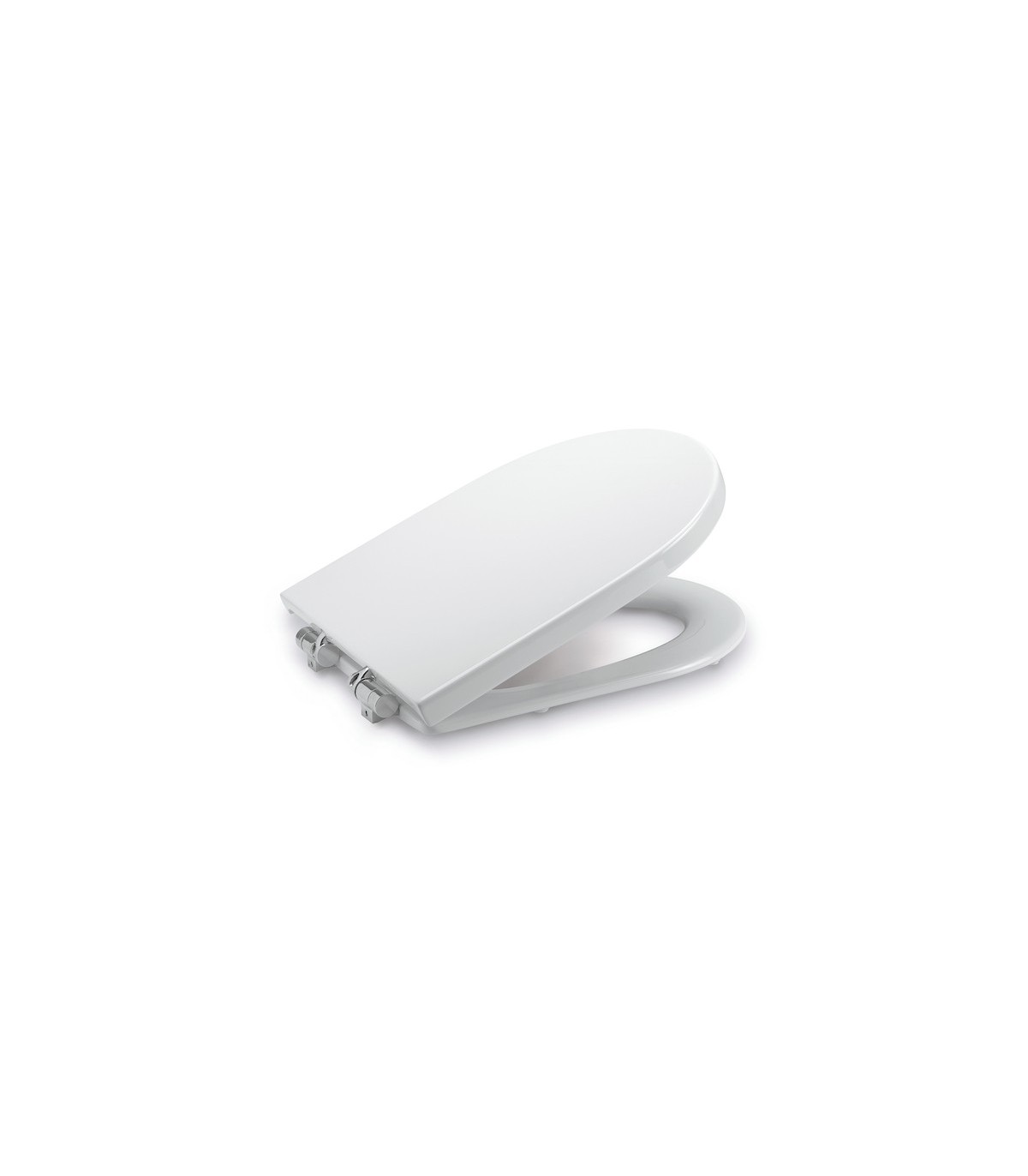 Tapa con asiento para inodoro modelo Happening de Roca con bisagras de acero inoxidable y caída amortiguada. Color Blanco.