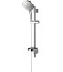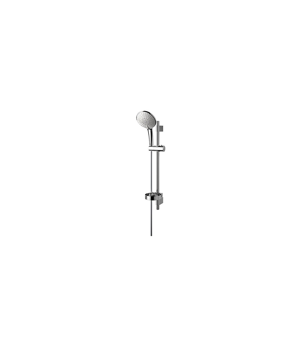 Conjunto de ducha compuesto por barra deslizante de 60 cms, teléfono de ducha con cabezal de 14 cms y 3 funciones de chorro. Incluye jabonera de serie.