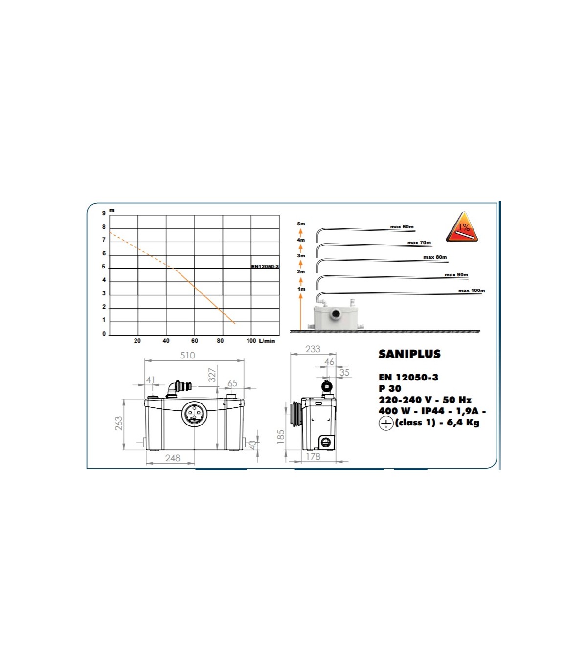 SANIPLUS permite evacuar las aguas negras hasta 5 metros en vertical o 100 metros en horizontal. El recorrido de evacuación se puede realizar con un tubo de tan solo 32 mm de diámetro