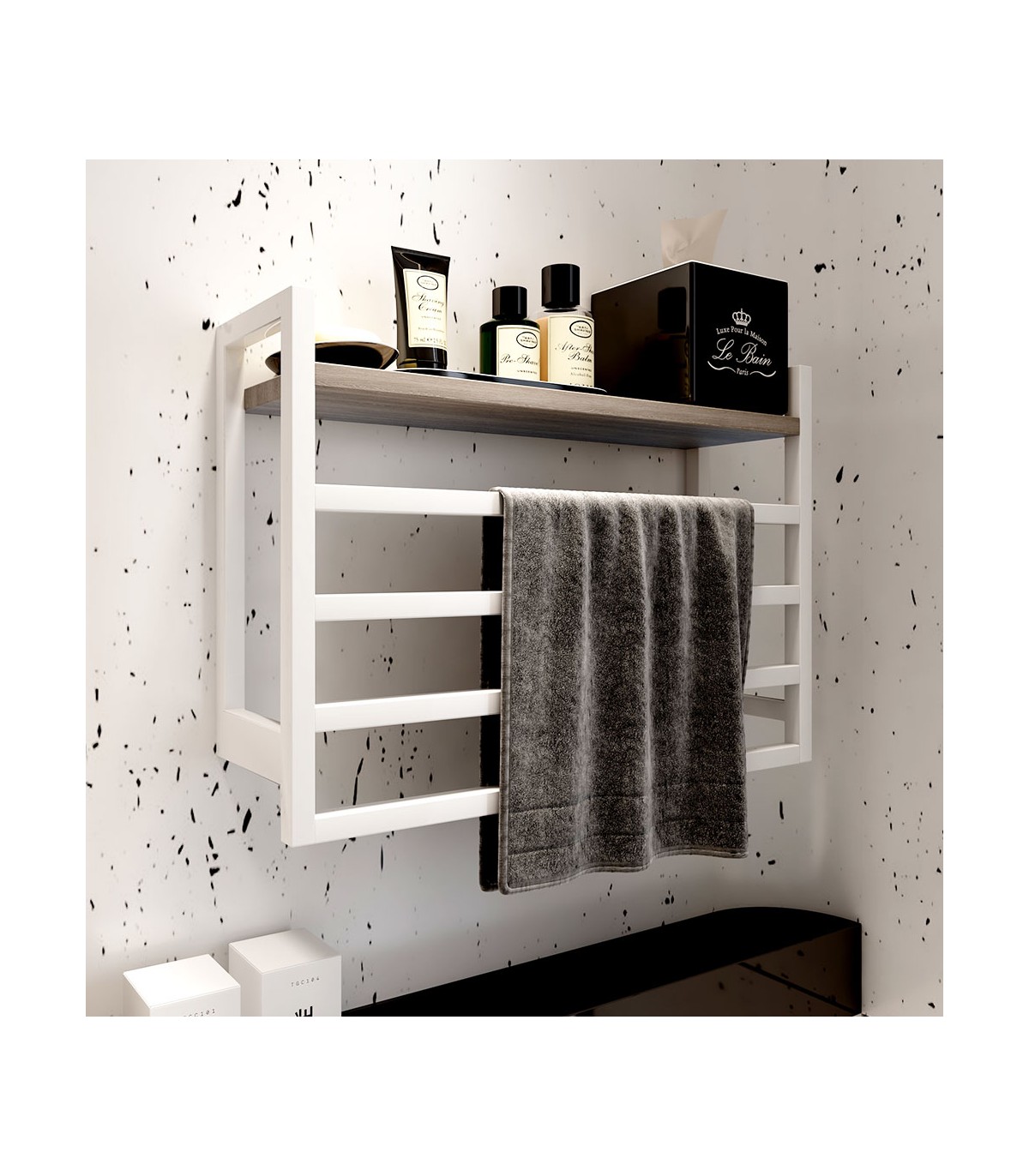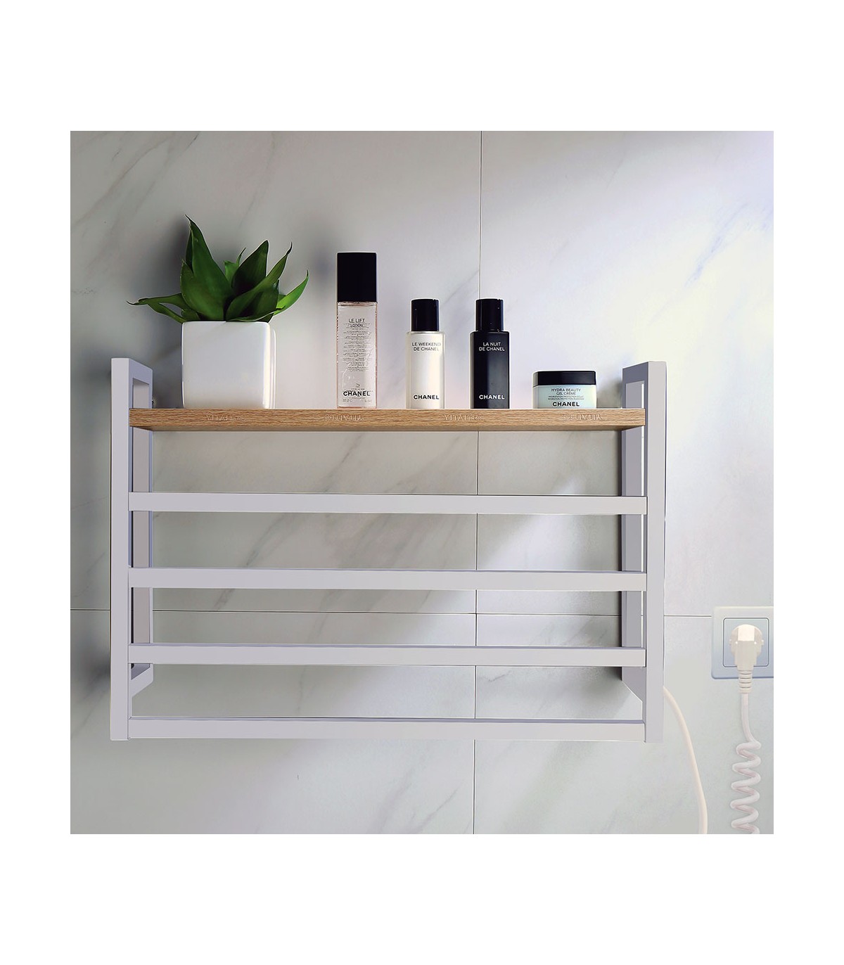 Toallero secatoallas eléctrico seco, sin líquidos circulantes, acabado blanco mate y madera, con estante repisa de madera, fácil montaje y forma de uso, encender y apagar, cable y enchufe incluidos.