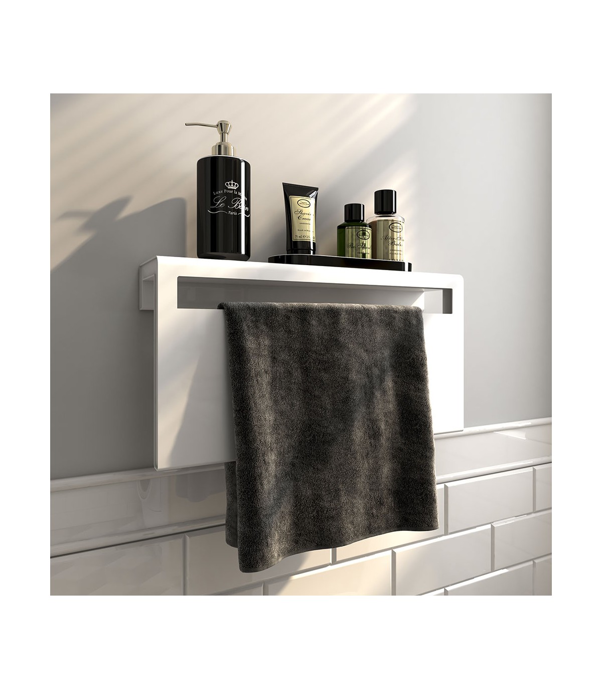 Toallero secatoallas eléctrico Karey en color blanco mate, seco, sin líquidos, acabado blanco mate, estante portaobjetos, fácil montaje y forma de uso, encender y apagar, cable y enchufe incluido.