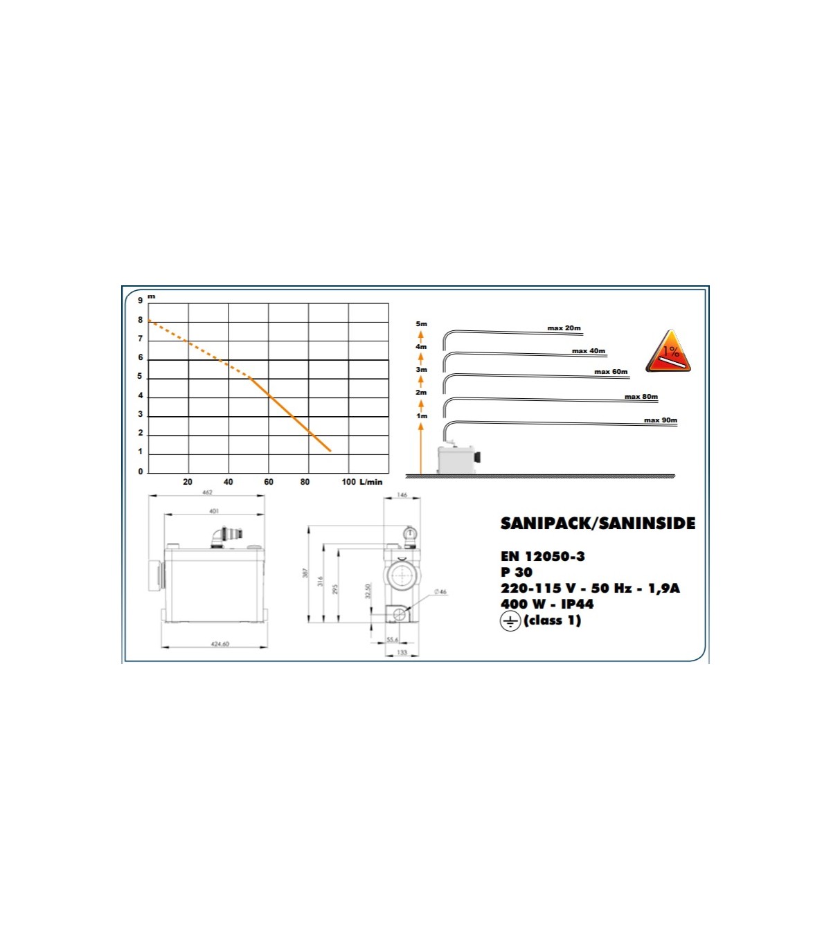 SANIPACK puede evacuar las aguas hasta 5 metros de altura o 50 metros de distancia (más si se realiza una pendiente en la parte horizontal del recorrido). A una altura de 1 metro, SANIPACK puede evacuar unos 95 litros por minuto. A 5 metros de altura, es decir 2 pisos, evacua unos 53 litros al minuto.