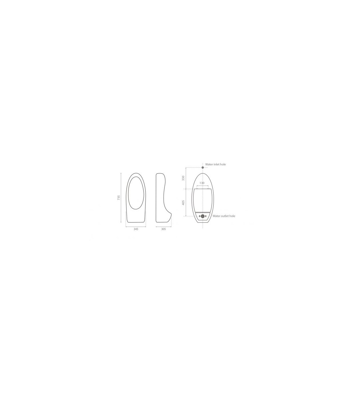 Urinario de diseño suspendido, modelo ONDA de Bathco. Medidas 735x345x305 mm. Entrada de agua superior.